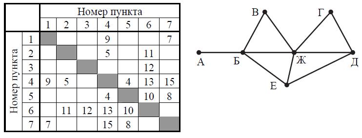 Вопрос № 1. На рисунке схема дорог Н-ского района изображена в виде графа, в таблицесодержатся сведения о протяжённости каждой из этих дорог (в километрах).Так как таблицу и схему рисовали независимо друг от друга, то нумерациянаселённых пунктов в таблице никак не связана с буквеннымиобозначениями на графе. Определите, какова протяжённость дорогииз пункта Г в пункт Ж. В ответе запишите целое число – так, как оно указанов таблице.